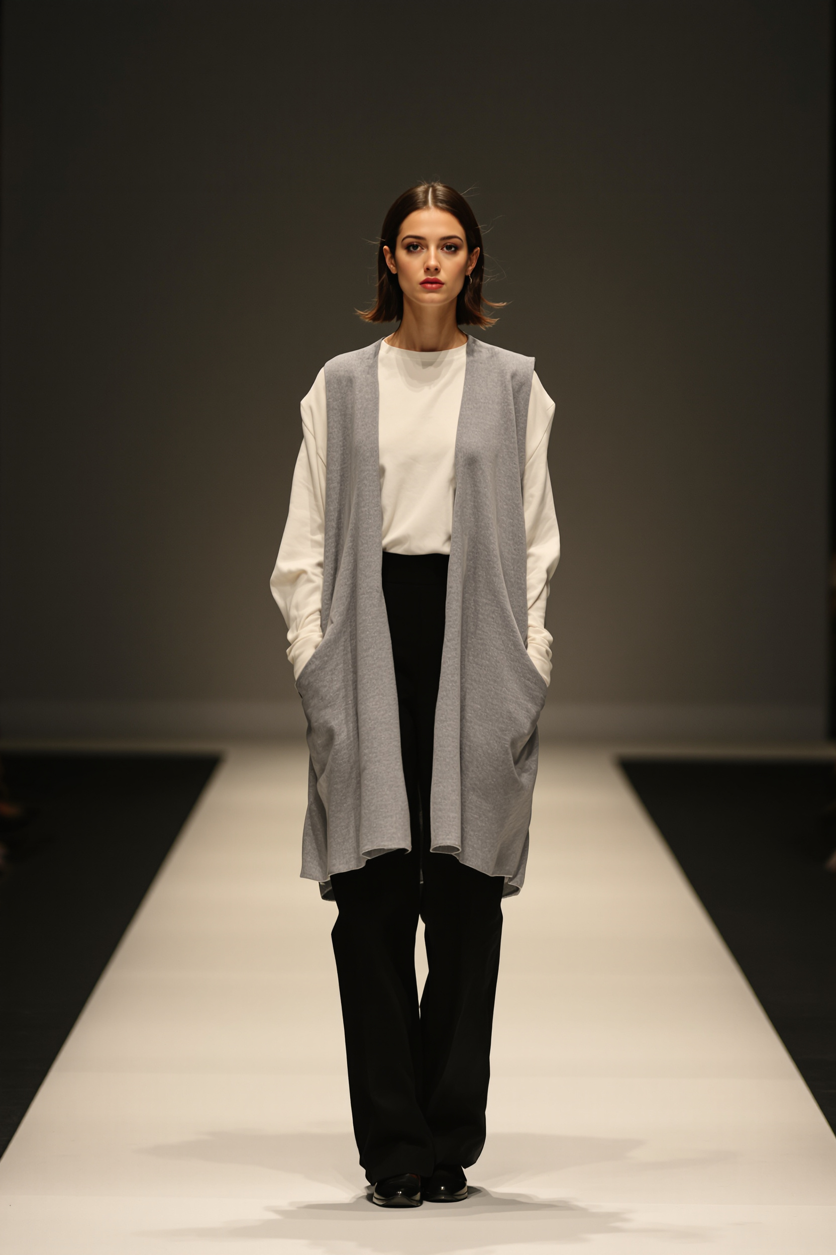 Женщина стоит на подиуме в темном помещении, смотрит прямо в камеру. На ней светлая базовая рубашка свободного кроя, поверх — серый удлиненный жилет без рукавов, прямые черные брюки, минималистичный фон, мягкий свет, средний план.