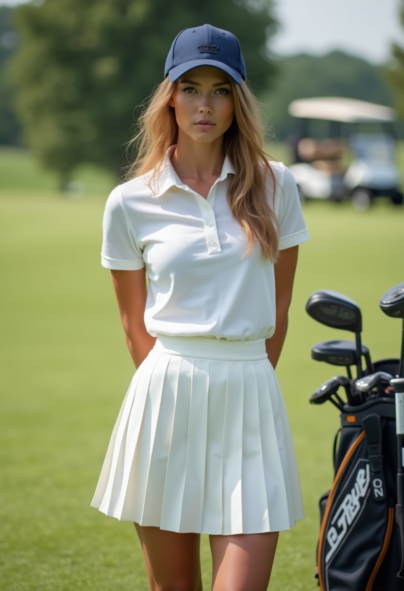 Женщина стоит на поле для гольфа. Выражение лица спокойное. Она одета в белую рубашку-поло, белую плиссированную мини-юбку. На голове темно-синяя бейзболка. Волосы распущены. Рядом с ней стоит сумка для гольфа с клюшками. На фоне четко видно поле для гольфа и гольф-кар. Old-money стиль. Цвет фото - желто-зеленый и белый. Кожа имеет оранжевый оттенок. Крупный план