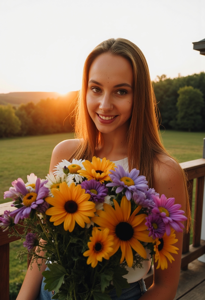 Женщина стоит на террасе, её лицо обрамлено массивным букетом из полевых цветов, которые будто только что были собраны с луга. Она смотрит в камеру с мечтательным выражением. Позади деревянные перила и дальний вид на лес. Освещение естественное, мягкие лучи заката добавляют тепла в сцену.