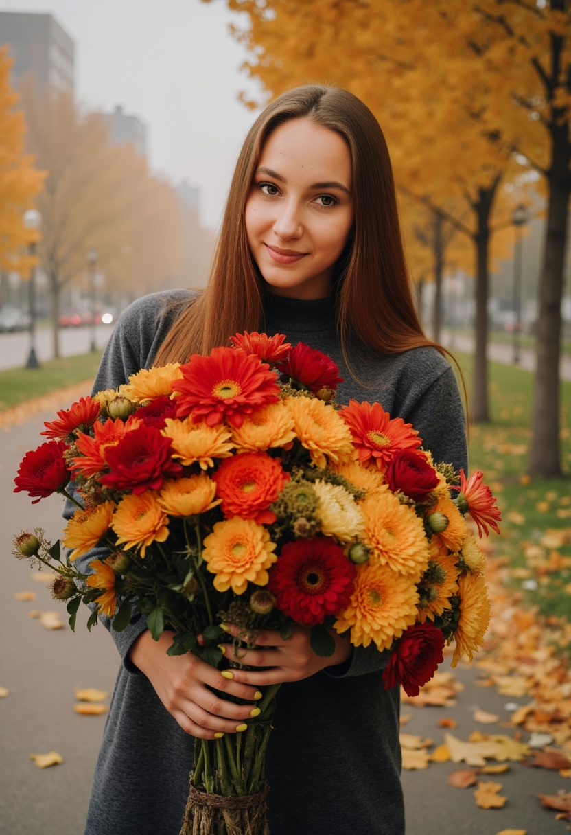 Женщина стоит на улице, обнимая огромный букет из осенних хризантем и рябины. Её лицо обрамлено цветами, она смотрит прямо в камеру с лёгким удивлением, будто только что получила этот подарок. Позади осенний парк, лёгкий туман создаёт мягкое освещение.