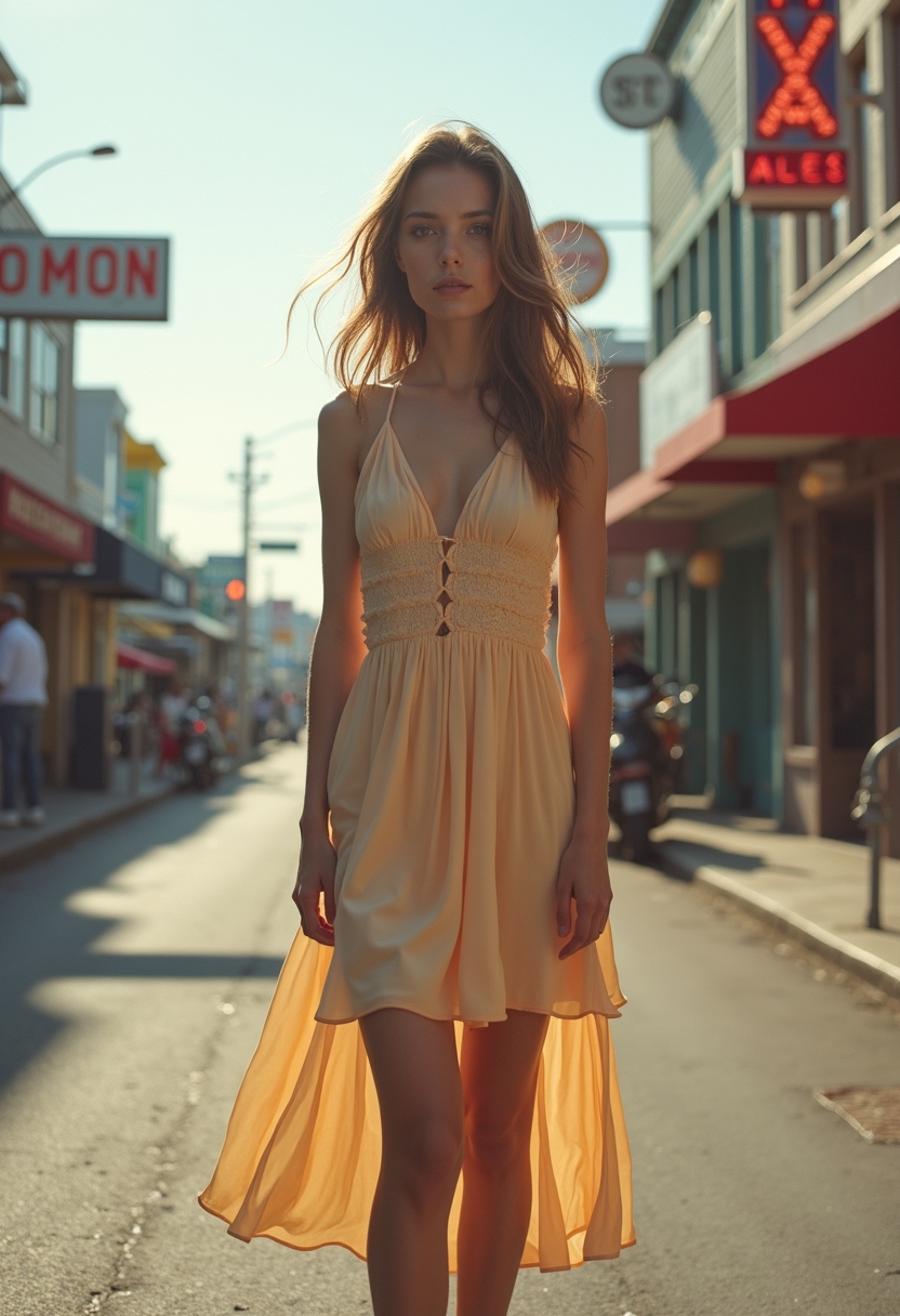 Женщина стоит на улице Скермерхорн, на полуострове Кони-Айленд. Она одета в легкое, яркое летнее платье, которое колышется на легком ветерке. Свет от зари нежно освещает её лицо, создавая мягкие тени. В ее глазах читается спокойствие и уверенность. На заднем плане видны характерные уличные здания с оригинальными фасадами и неоновыми вывесками, а также бирюзовое море на горизонте. Асфальт под ногами бледный и слегка влажный от утренней росы. Крупный план, чтобы акцентировать внимание на женщине и окружающей её атмосфере