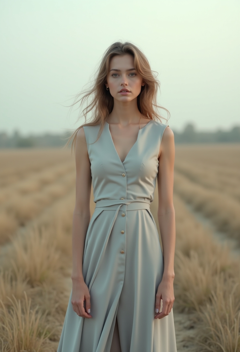 Примерить образ на себеЖенщина стоит одна в центре пустого поля, одетая в лёгкое льняное платье цвета слоновой кости. Вокруг абсолютная пустота с бежево-серыми оттенками земли и неба. Она смотрит прямо в камеру, взгляд спокоен и уверен. Крупный план.