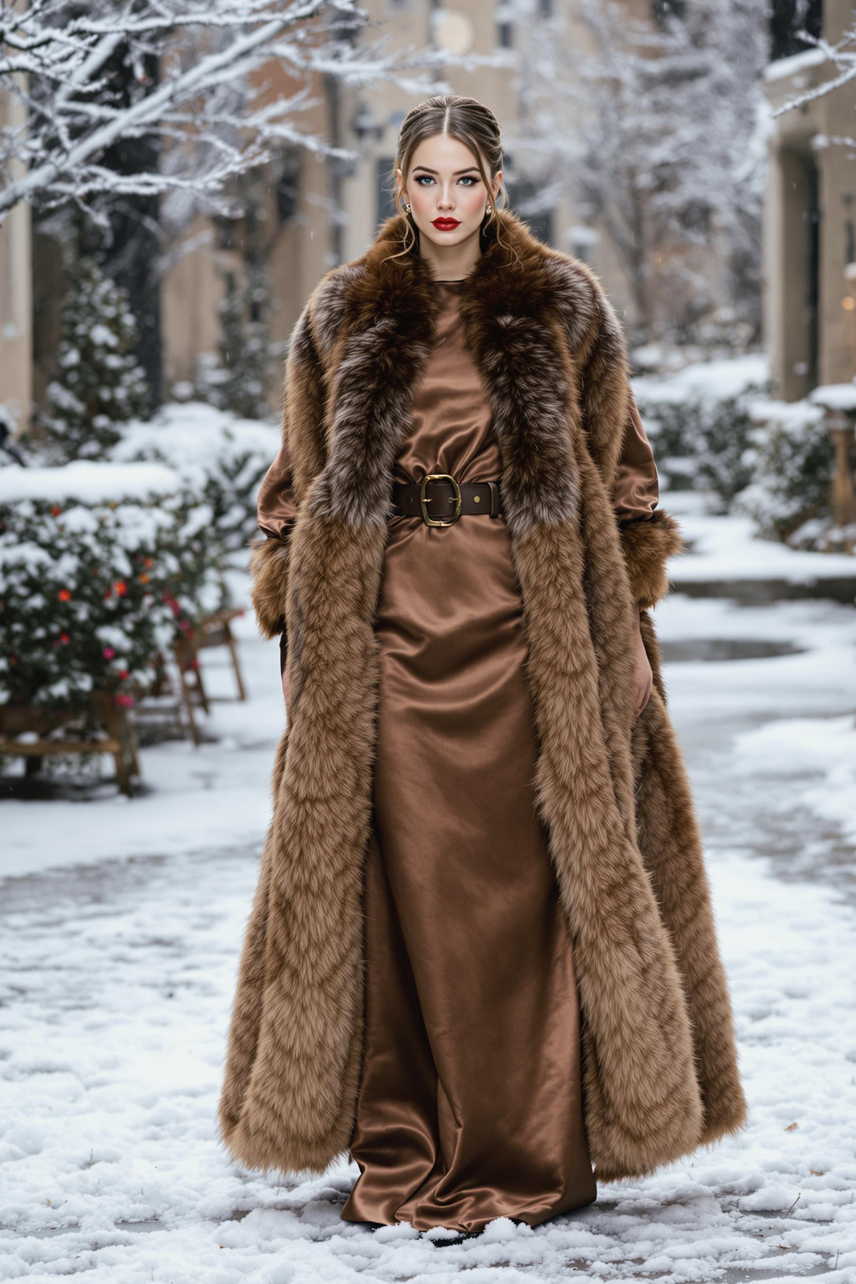 Женщина стоит посреди заледенелого двора, на ней элегантное коричневое атласное платье с рукавами-фонариками, поверх — накинута длинная накидка из лисьего меха с бархатной подкладкой, на талии широкий кожаный пояс. Женщина смотрит прямо в камеру, вокруг рассеивается холодный свет.