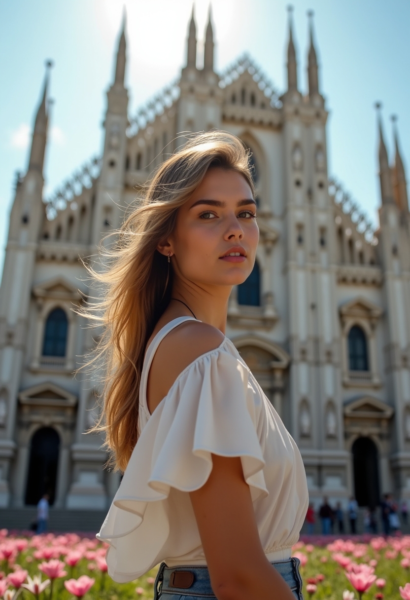 Женщина стоит, повернувшись в профиль к камере, на фоне величественного Дуомо в Милане. Она одета в стильное летнее платье, которое gently колышется на ветру. Солнечный свет освещает ее лицо, создавая мягкие тени и подчеркивая ееFeatures. Вокруг девушка окружена яркими цветами на улицах, а архитектура собора создает драматичный контраст с небом. Яркие детали здания и гармония цветов создают впечатляющую картину.