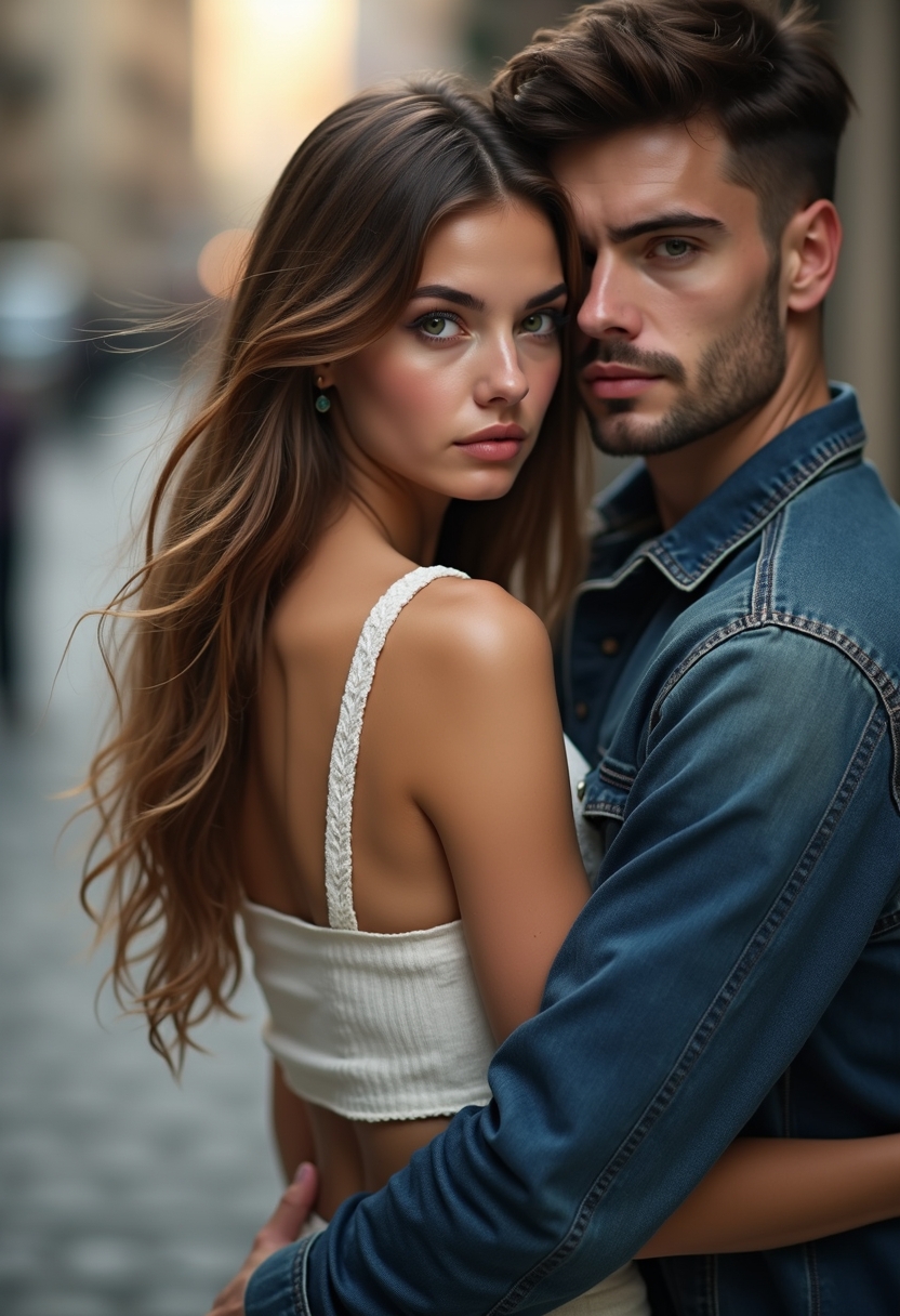 Женщина стоит спиной к камере, её парень обнимает её сзади, его лицо в волосах. Она поворачивает голову и смотрит в объектив, выражение лица задумчивое. Акцент на её эмоциях и теле.