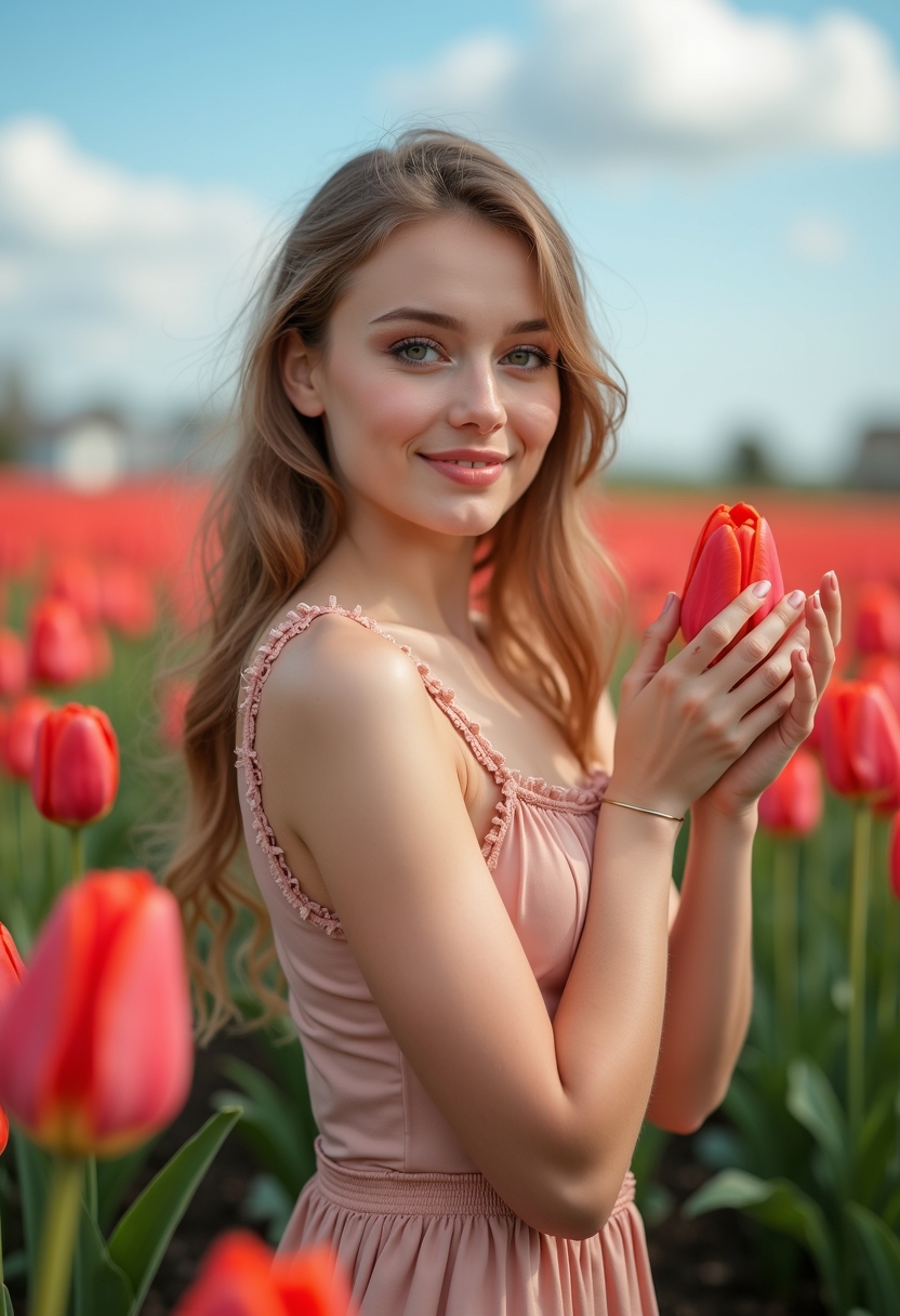 Женщина стоит среди высоких тюльпанов, её руки аккуратно прикасаются к лепесткам, создавая ощущение бережности. В её взгляде спокойствие, а лёгкая улыбка подчёркивает радость момента. Позади бескрайнее поле тюльпанов, голубое небо с белыми облаками. Ближний план, акцент на цветах и естественной грации.