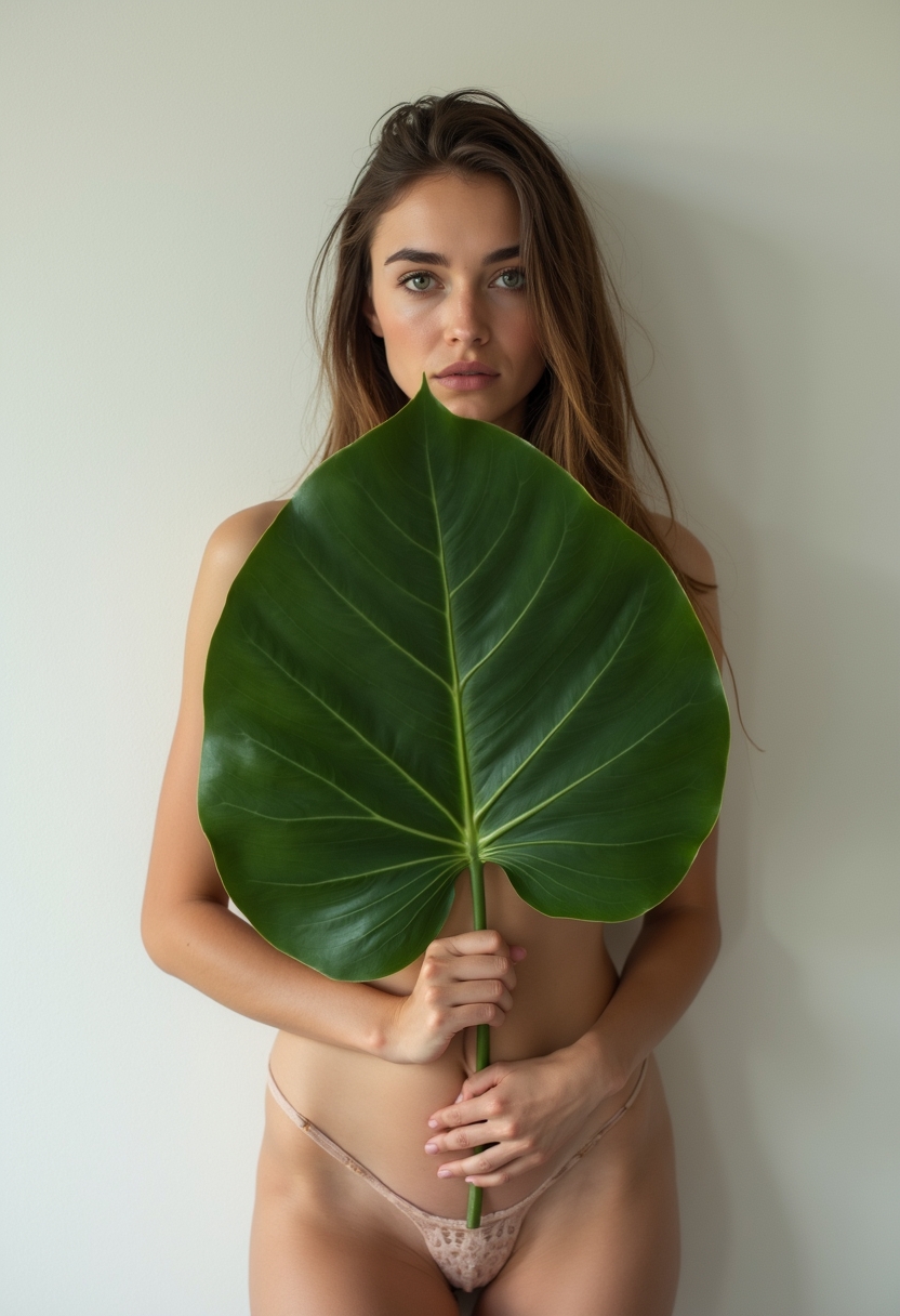 Женщина стоит у белой стены студии, обнажённая, но держа перед собой крупный зелёный лист, закрывающий интимные части тела. Её взгляд глубокий и уверенный, свет ровный и мягкий, создаёт лёгкую тень на фоне. Крупный план, подчёркивающий естественность и экзотичность сцены.