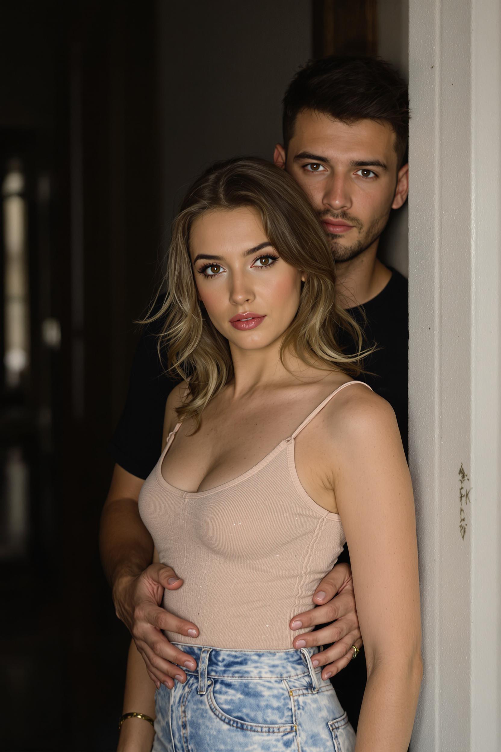 Женщина стоит у двери, слегка прислонившись к косяку, её парень обнимает её со спины, его лицо скрыто за её плечом. Она смотрит прямо в камеру, мягкий свет выделяет её черты и уверенный взгляд. В центре внимания — её эмоции и женственность.