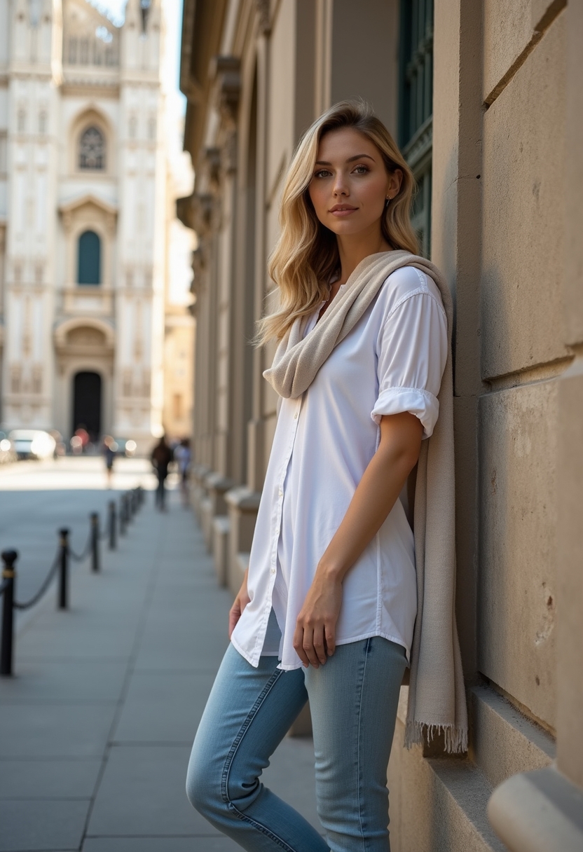 Женщина стоит у кафедрального собора Дуомо в Милане, облокотившись на каменную стену с элементами готической архитектуры. Она одета в стильное платье пастельного цвета, его длина до колен, что подчеркивает её фигуру. На ногах у неё удобные туфли, а на плечах лёгкий шарф. Фон собора величественен, с яркими витражами и детальной резьбой, а солнце освещает сцену, создавая мягкие тени. Её лицо видно, она смотрит в сторону камеры, лёгкая улыбка подчеркивает атмосферу спокойствия и уверенности. Пол перед ней мощеный, а вокруг тихая городская улица.