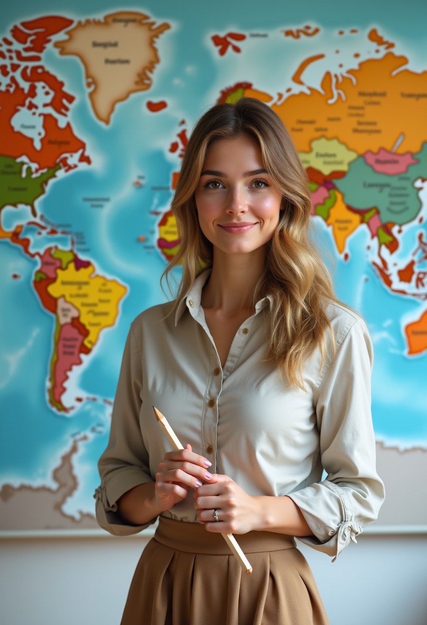 Женщина стоит у карты мира, одетая в светлую рубашку и юбку. Она держит в руках указку и учебник, глядя в объектив с лёгкой полуулыбкой. Крупный план, создающий атмосферу урока географии.