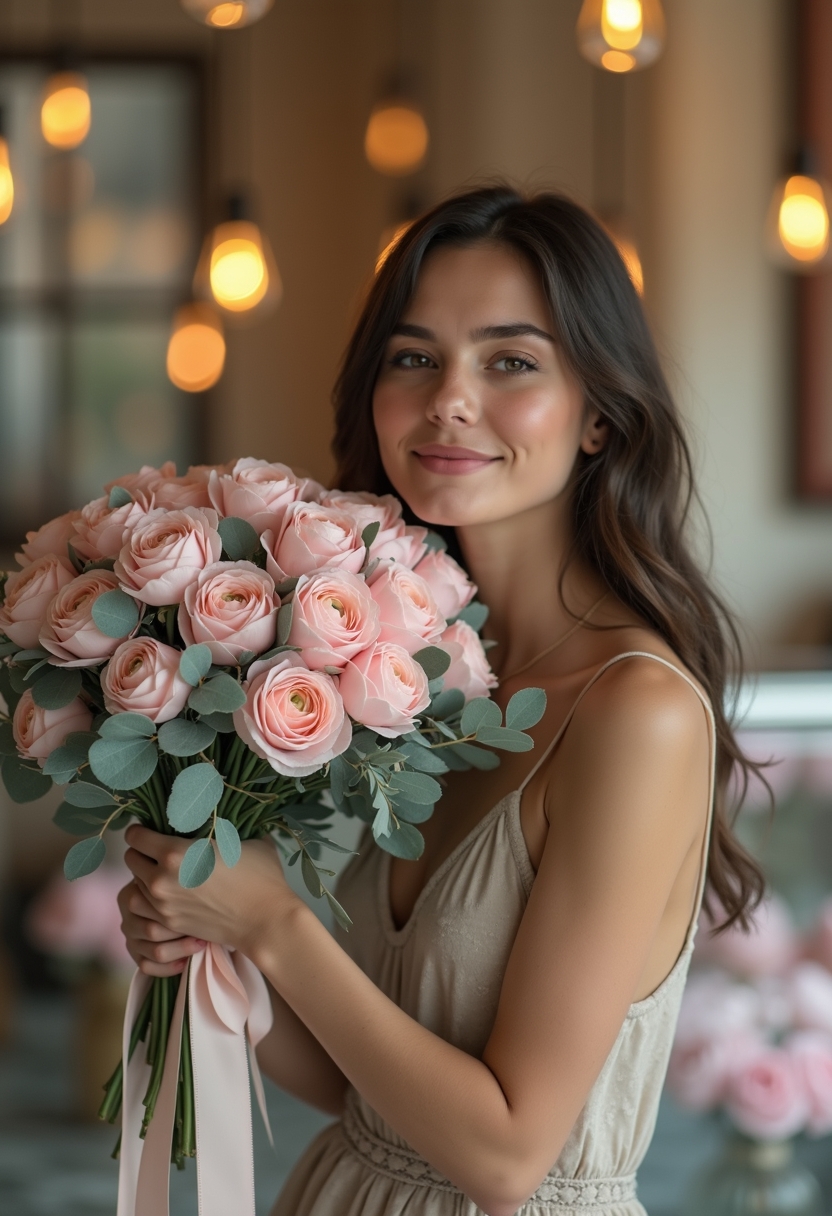 Женщина стоит у стеклянной витрины, её лицо выглядывает из-за огромного букета из нежно-розовых ранункулюсов и эвкалипта. Она улыбается, её пальцы аккуратно держат ленту, перевязывающую стебли. Освещение тёплое, подчёркивающее романтику момента.