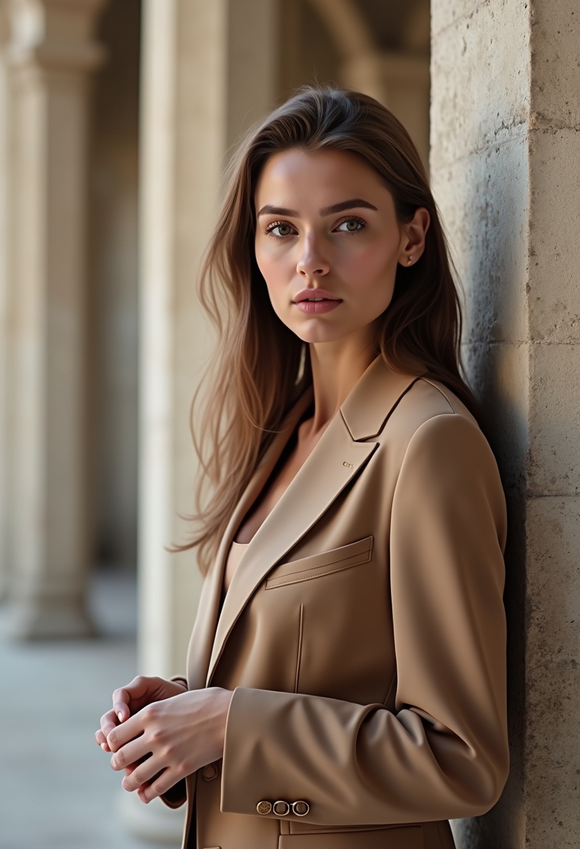 Женщина стоит на фоне Виллы Адриана, обладая уверенным и спокойным выражением лица. Она одета в легкое летнее платье нежного пастельного оттенка, которое аккуратно развевается на ветру. Позади нее величественные руины древнеримской виллы, с колоннами и арками, окруженные зелеными холмами. Освещение...