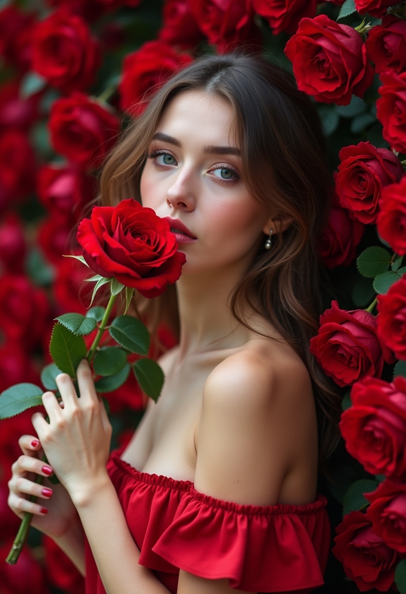 Женщина стоит у стены, полностью покрытой красными розами. Она держит в руках один большой бутон, поднесённый к губам, взгляд слегка томный и загадочный. Крупный план, подчёркивающий чувственность и насыщенность цвета.