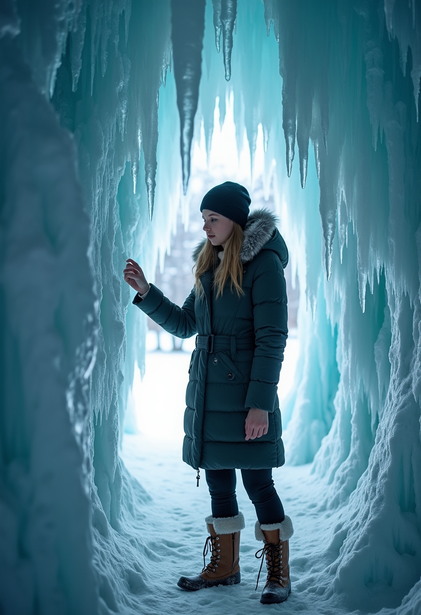 Женщина стоит у входа в ледяную пещеру, её руки касаются замёрзших сталактитов. Вокруг неё стены пещеры переливаются голубыми оттенками, создавая мистическую атмосферу. Взгляд задумчиво направлен вниз. Крупный план, подчёркивающий красоту зимнего Байкала.