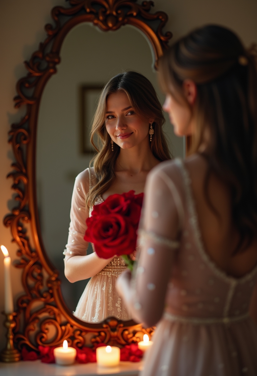 Женщина стоит у зеркала, держа в руках крупную розу, её отражение слегка размыто, создавая атмосферу загадочности. Она смотрит в камеру с лёгкой улыбкой, вокруг зеркала расположены маленькие свечи и лепестки. Крупный план, создающий интимную и романтичную атмосферу.
