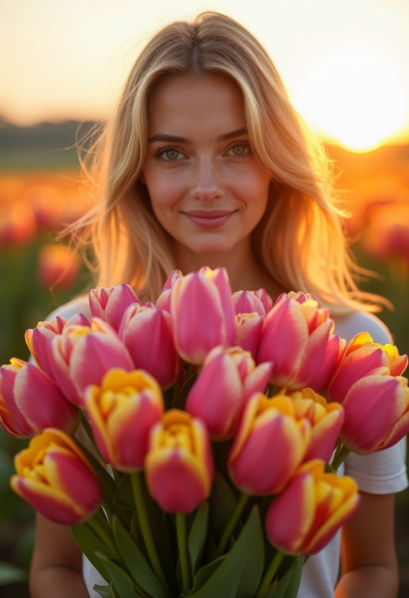Женщина стоит в цветочном поле, держа в руках огромный букет ярко-розовых и жёлтых тюльпанов. Её лицо освещено тёплыми лучами заката, а волосы слегка развеваются на ветру. Она смотрит прямо в камеру с лёгкой улыбкой. Крупный план, акцент на её лице и насыщенных цветах.