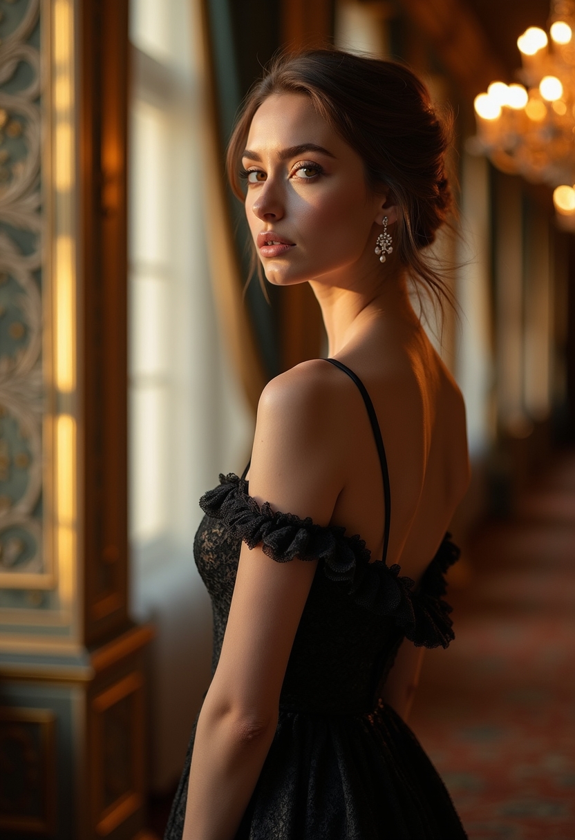 Женщина стоит в Мариинском театре в Санкт-Петербурге, в элегантном вечернем платье темного цвета, с изящными аксессуарами. Ее поза расслабленная, она слегка наклонила голову, создавая игривые тени на стенах театра с помощью мягкого света, который проникает из окон. Вокруг богатая архитектура интерьера, с великолепными золотыми деталями и роскошными занавесами. Легкий блеск люстр отражается на ее лице, подчеркивая ее выразительные черты. Крупный план показывает детали ее макияжа и украшений, а также игру света и теней на фоне театральных стен.