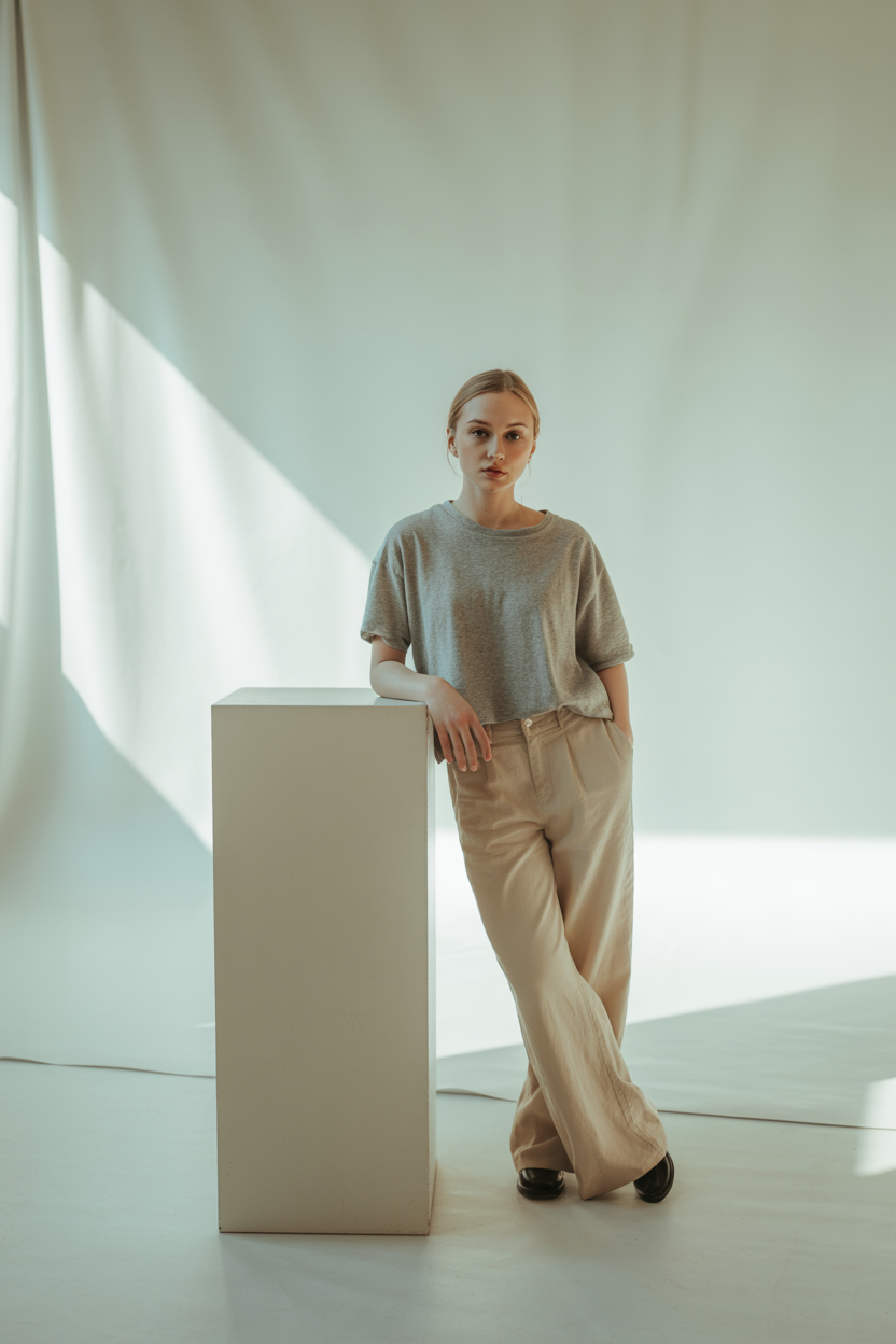 Женщина стоит в минималистичной студии на фоне белой циклорамы, одета в свободную светлую футболку и широкие бежевые брюки, одна рука опирается на высокий белый куб, корпус слегка развёрнут к камере, уверенный прямой взгляд, мягкий рассеянный свет подчёркивает чистоту образа.