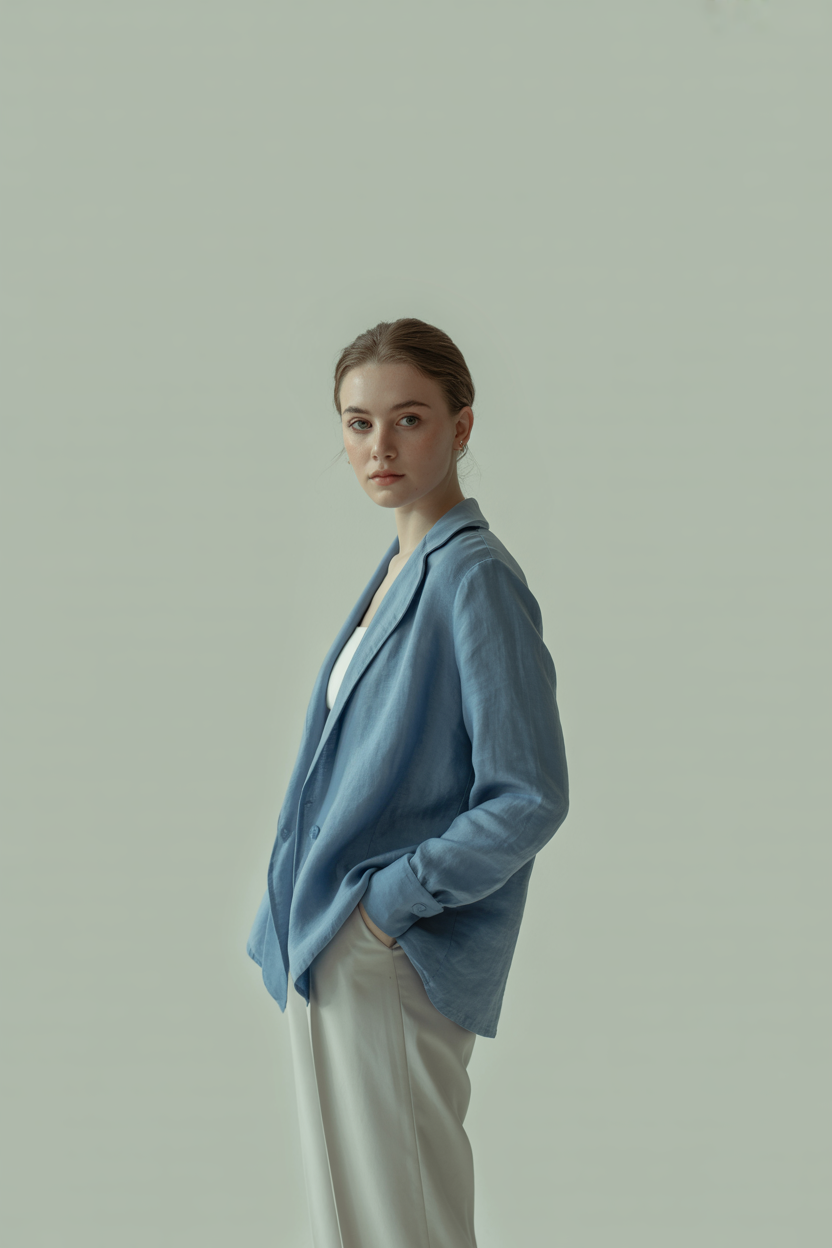 Женщина стоит в минималистичной студии на фоне светлой циклорамы, одета в лаконичный длинный жакет нежно-голубого оттенка и светлые прямые брюки. Одна рука в кармане, вторая свободно опущена вдоль тела. Средний план, уверенный взгляд прямо в камеру, мягкое студийное освещение, чистое пространство вокруг.