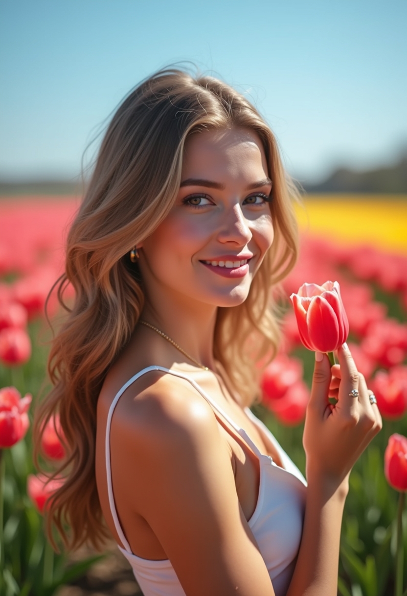 Женщина стоит в поле тюльпанов, касаясь одного из цветков кончиками пальцев, её взгляд направлен в камеру, губы приоткрыты в лёгкой улыбке. На заднем плане разноцветные ряды цветов простираются до горизонта, а над головой ясное голубое небо. Ближний план, подчёркивающий гармонию с природой.
