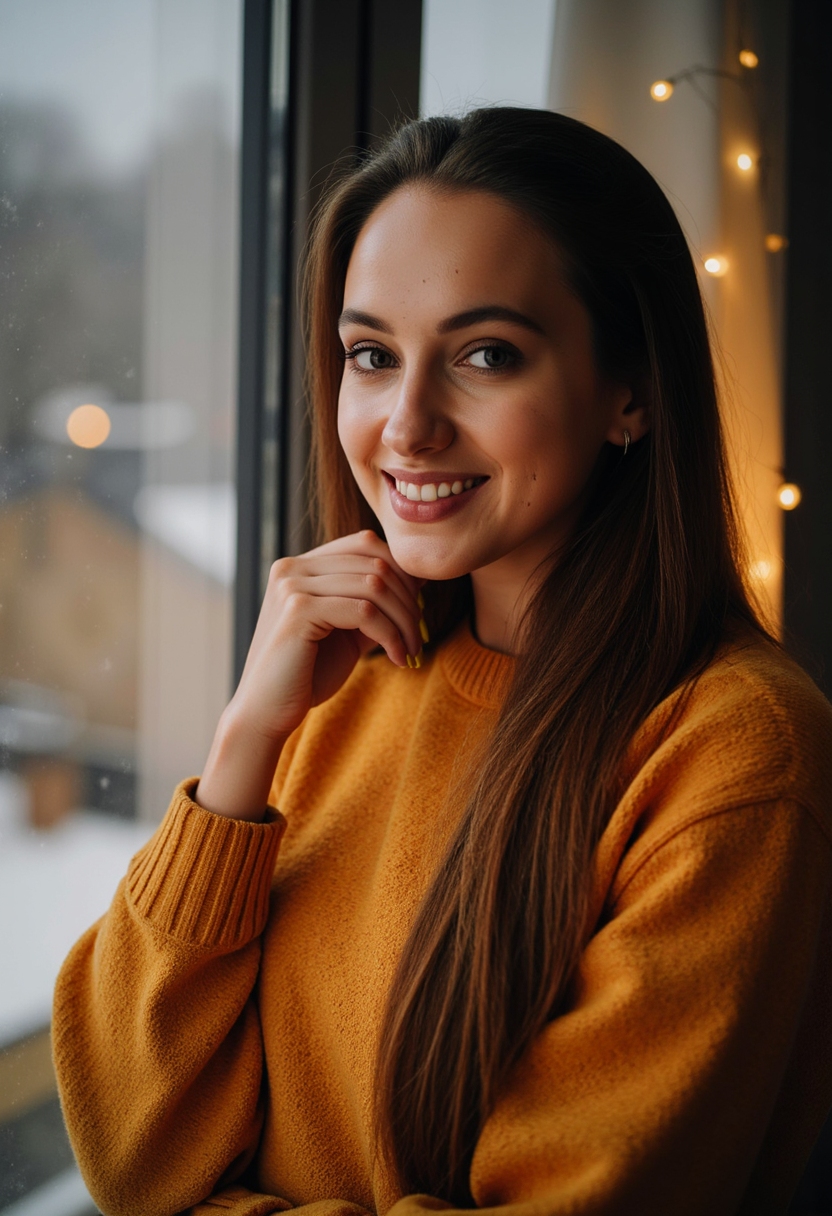Примерить образ на себеЖенщина в тёплом белом свитере стоит у заснеженного окна, держит кружку горячего какао, смотрит прямо в камеру