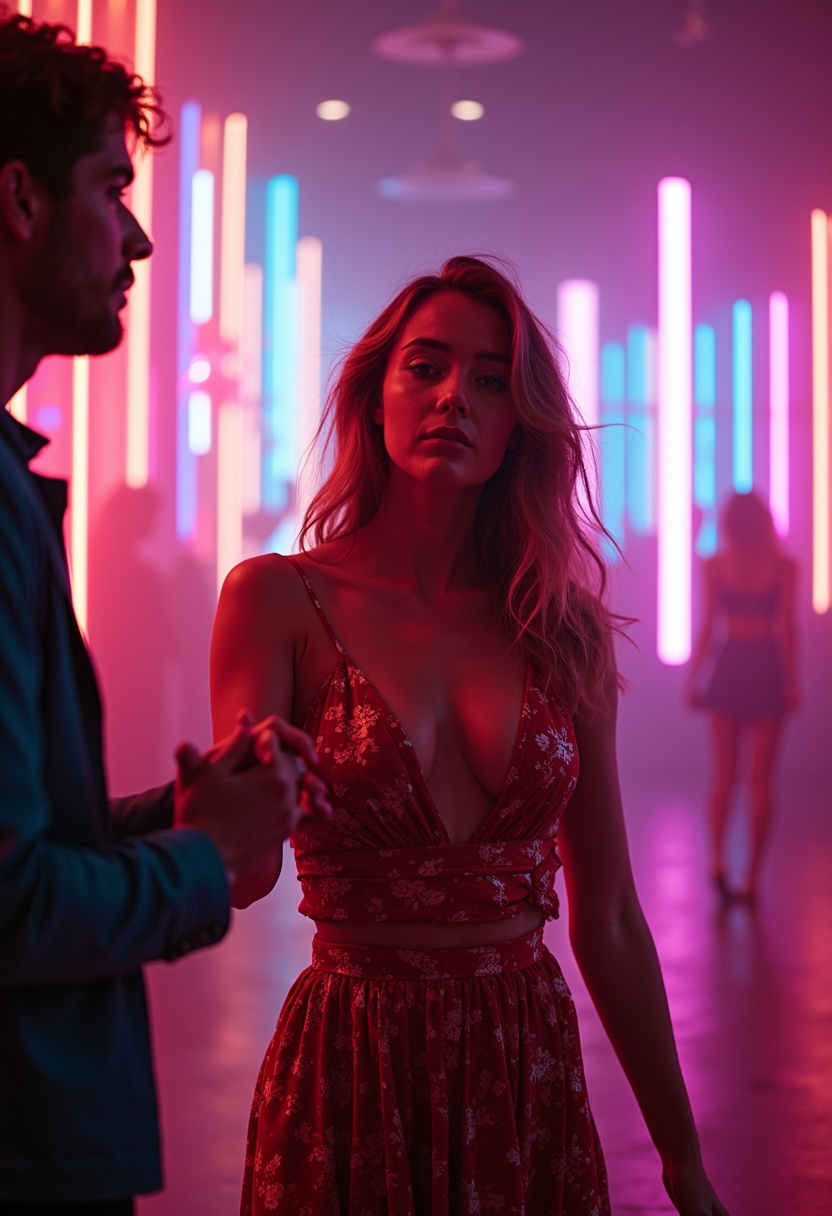 Женщина танцует на фоне яркого неонового света, её парень смотрит на неё из тени. Она — в центре, живая и сияющая. Взгляд прямо в камеру, акцент на её свободе и яркости.