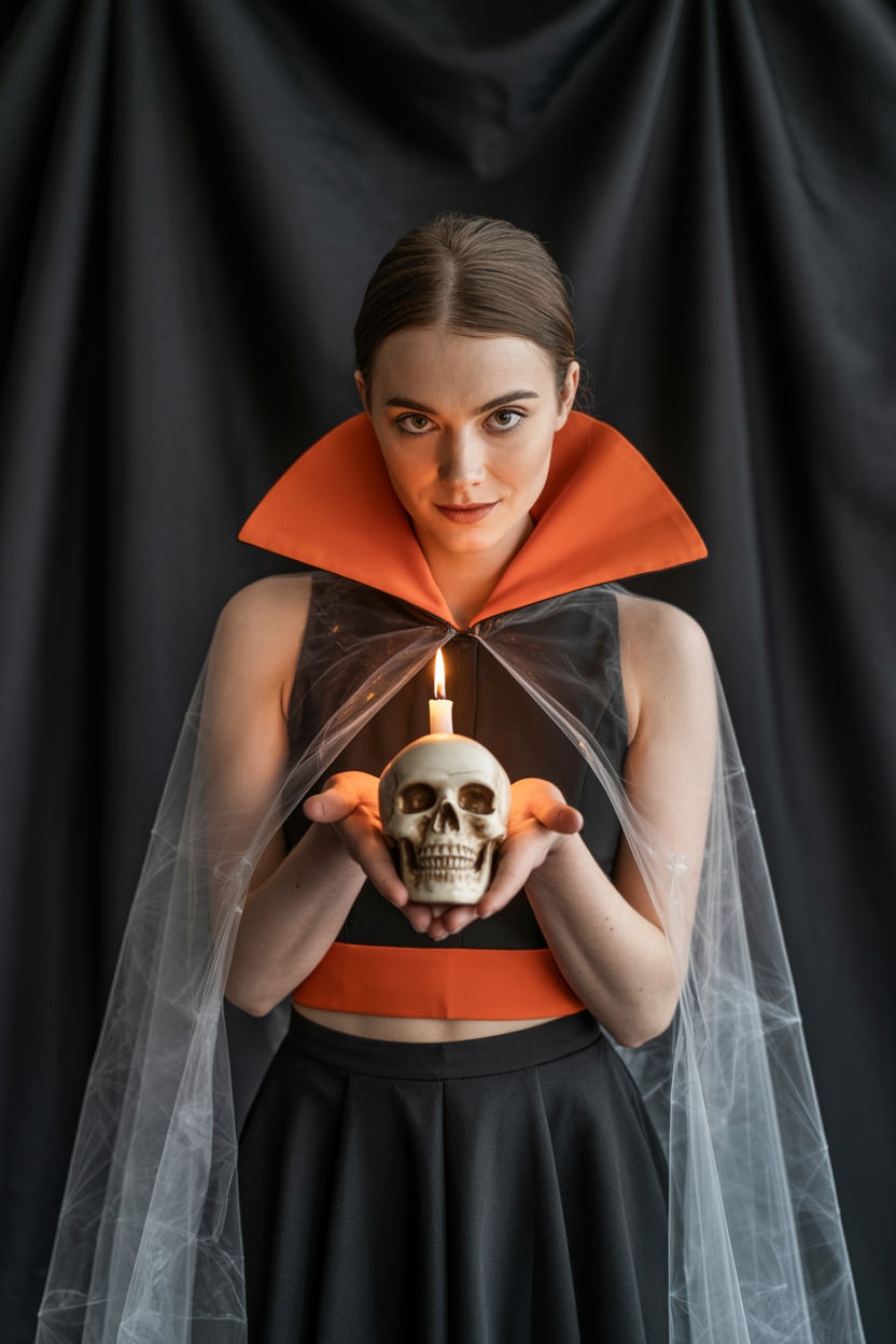 Женщина у гладкой чёрной стены, на ней укорочённое чёрное платье с ярко-оранжевым воротником-стойкой и поясом, на плечах прозрачная накидка в виде паутины, в руках держит небольшой череп из белого фарфора, наклоняется, будто приглашая в хэллоуинскую игру, пристально смотрит в камеру, вокруг свет одной свечи.