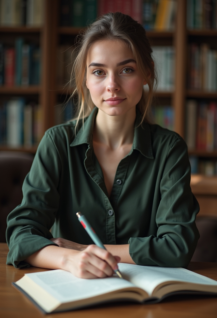 Женщина учительница сидит у школьной библиотеки с открытой книгой, слегка наклонив голову к камере. Её образ — мягкий, интеллигентный. Позади стеллажи и приглушённый свет. Крупный план, создающий атмосферу тишины и уюта.