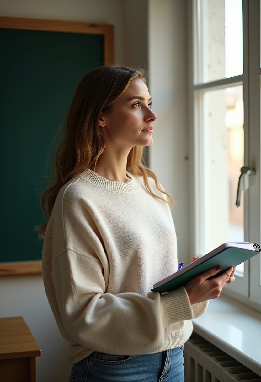 Женщина учительница в светлом свитере стоит у окна, в руках — тетрадь и ручка. Она смотрит вдаль, позади мягкий солнечный свет и классная доска. Крупный план, подчёркивающий вдумчивость и спокойствие.