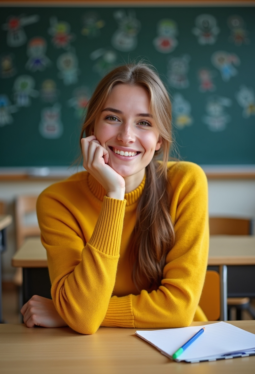 Женщина учительница в ярком свитере сидит за школьной партой среди пустого класса, облокотившись на руку. Она улыбается, глядя в объектив, позади доска с детскими рисунками. Крупный план, создающий ощущение тепла и доступности.