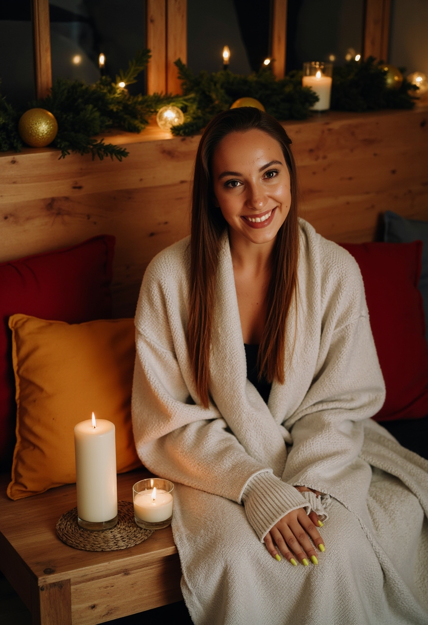 Женщина, укутанная в мягкий плед и сидящая на деревянной лавке со свечами, улыбается в камеру, окруженная уютными рождественскими украшениями и ароматом хвои.