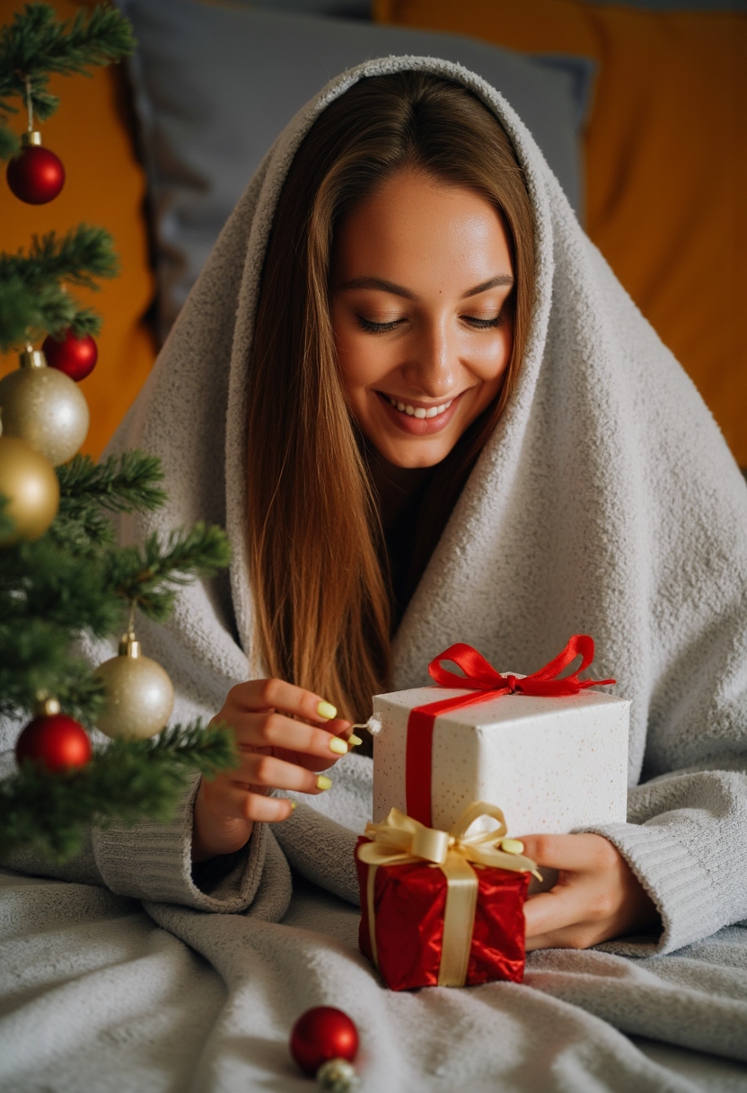 Женщина, укутанная в мягкий плед, с сюрпризом на лице открывает один из подарков под рождественской елкой, улыбается в камеру, создавая мгновение радости и удивления