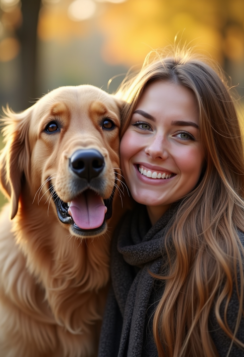 Примерить образ на себеЖенщина улыбается, её лицо рядом с мордой золотистого ретривера, который смотрит прямо в камеру. Их головы почти соприкасаются, его мех мягко подсвечен тёплым солнечным светом. Позади размытый фон парка с осенними листьями.
