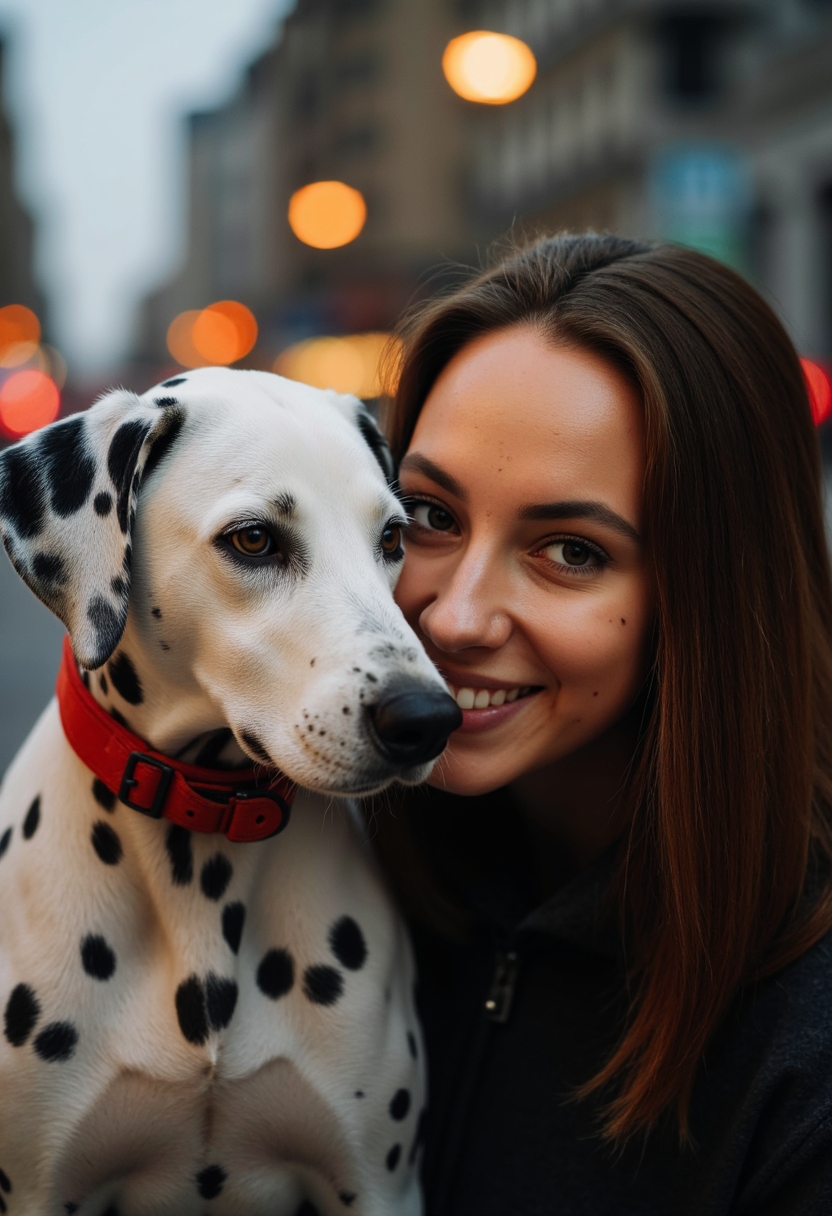 Женщина улыбается, слегка наклонившись к морде далматина, который смотрит прямо в камеру. Его пятнистая шерсть выделяется на фоне размытых городских огней. Освещение вечернее, с лёгким неоновым свечением.