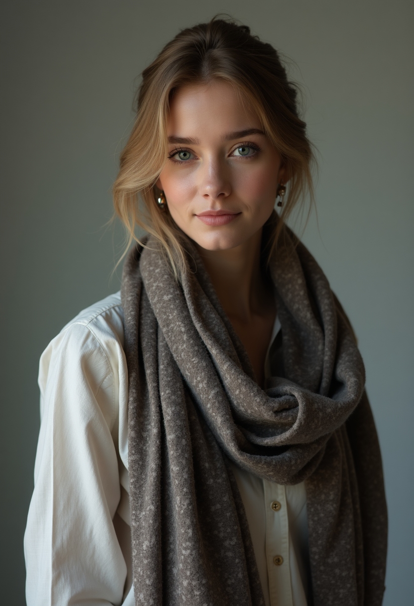 Женщина в аккуратном повседневном образе с шарфом, студийное освещение, смотрит прямо в камеру, задний фон слегка размыт