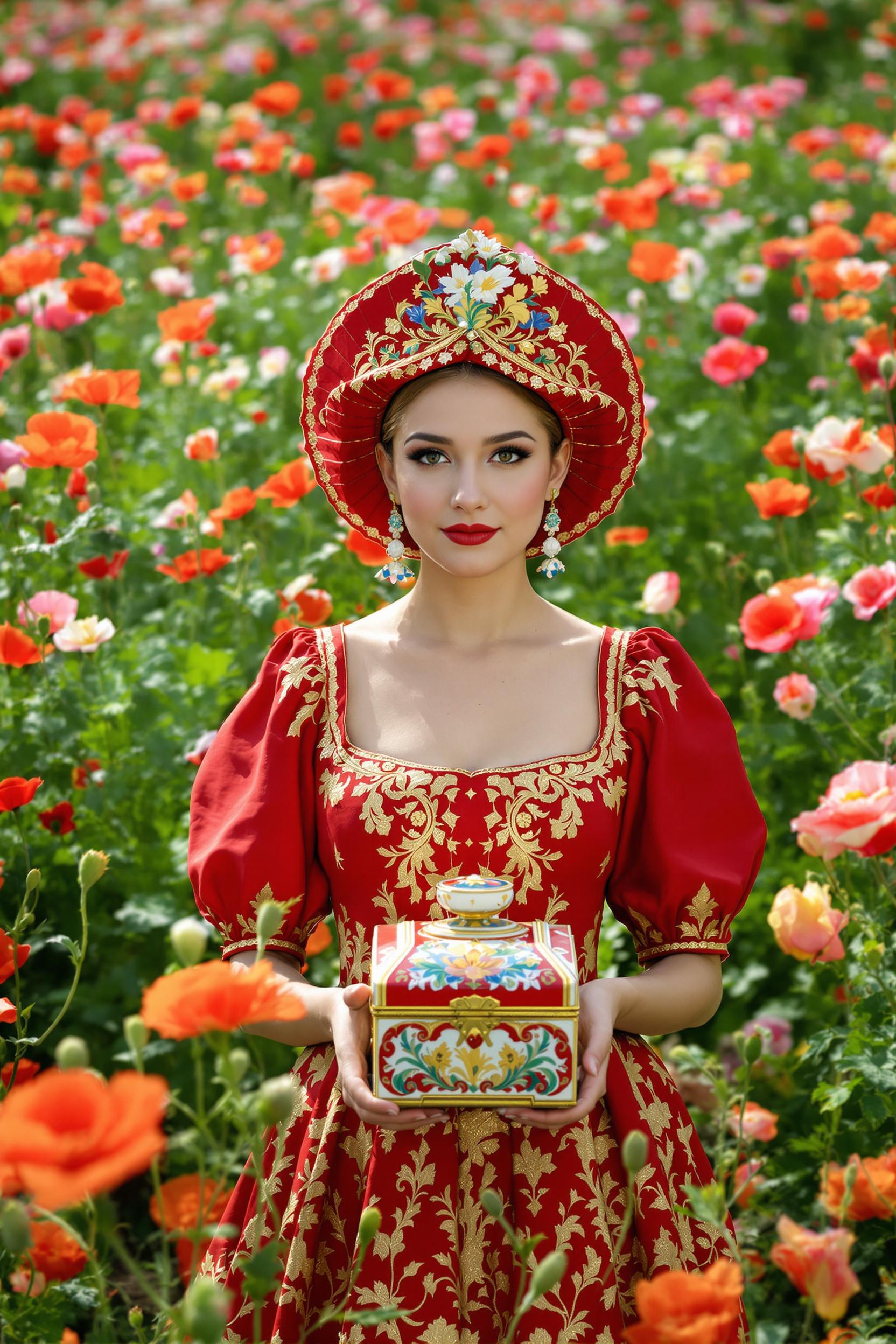 Женщина в алом сарафане с золотым узором и высоким кокошником стоит среди цветущих маков, держит в руках расписной ларец, смотрит прямо в камеру, вокруг зелёная трава и летний свет. Волшебная атмосфера русской сказки.