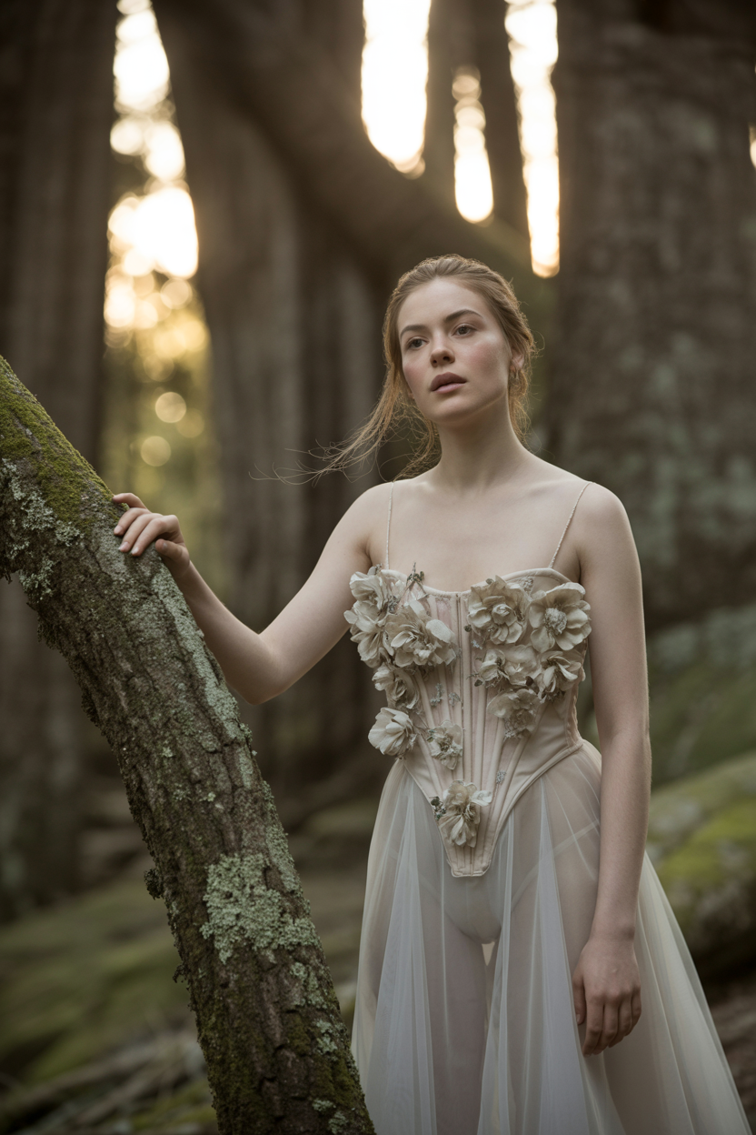 Примерить образ на себеЖенщина в атмосферном лесу на опушке под высокими древними деревьями в элегантном свадебном платье с полупрозрачной легкой юбкой и корсетом, украшенным крупными цветочными аппликациями, стоит среди стволов, держит руку на ветке, смотрит прямо в камеру, вокруг мягкий золотой свет заката и природная...