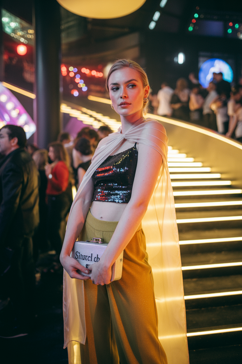 Женщина в атмосферном ночном клубе, одета в черный кроп-топ с пайетками и высокие золотистые брюки-кюлоты, поверх легкая прозрачная накидка, в руках миниатюрная клатч-сумка, стоит у светящейся лестницы, слегка обернувшись и смотрит прямо в камеру. Вокруг отражения разноцветных огней, ощущение праздника и энергетики вечеринки.