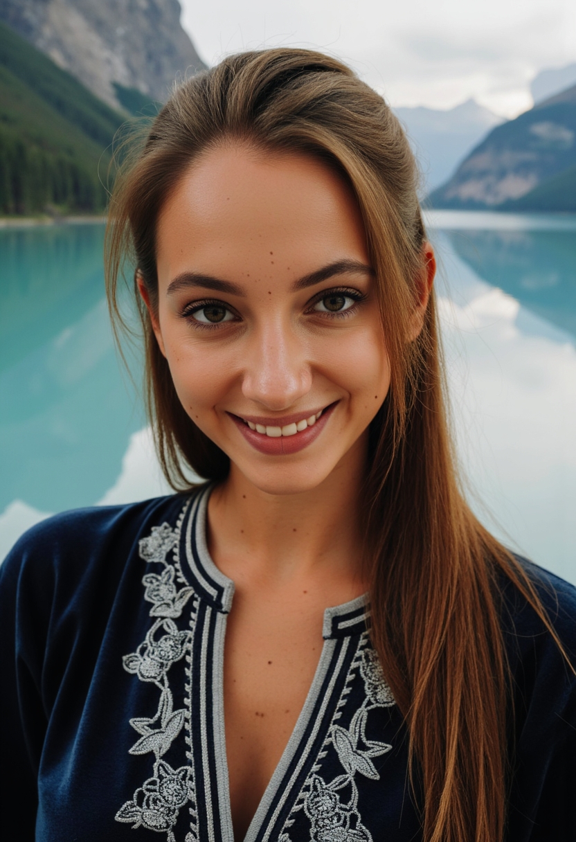 Женщина в бархатном тёмно-синем наряде с серебряной вышивкой улыбается, её взгляд искренний. Ветер слегка колышет её волосы, позади бирюзовые воды горного озера. Ближний план, акцент на эмоциях и текстуре ткани.