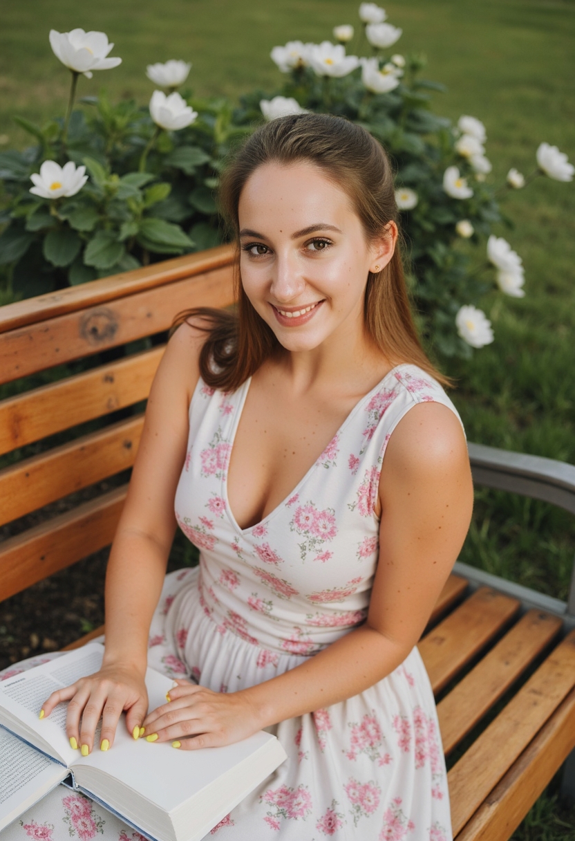 Женщина в бело-розовом платье с цветочным узором сидит на деревянной скамейке в парке. Она держит в руках книгу и смотрит в камеру с лёгкой улыбкой. Позади виден цветущий сад. Освещение мягкое, акцент на её умиротворении и весенней атмосфере.