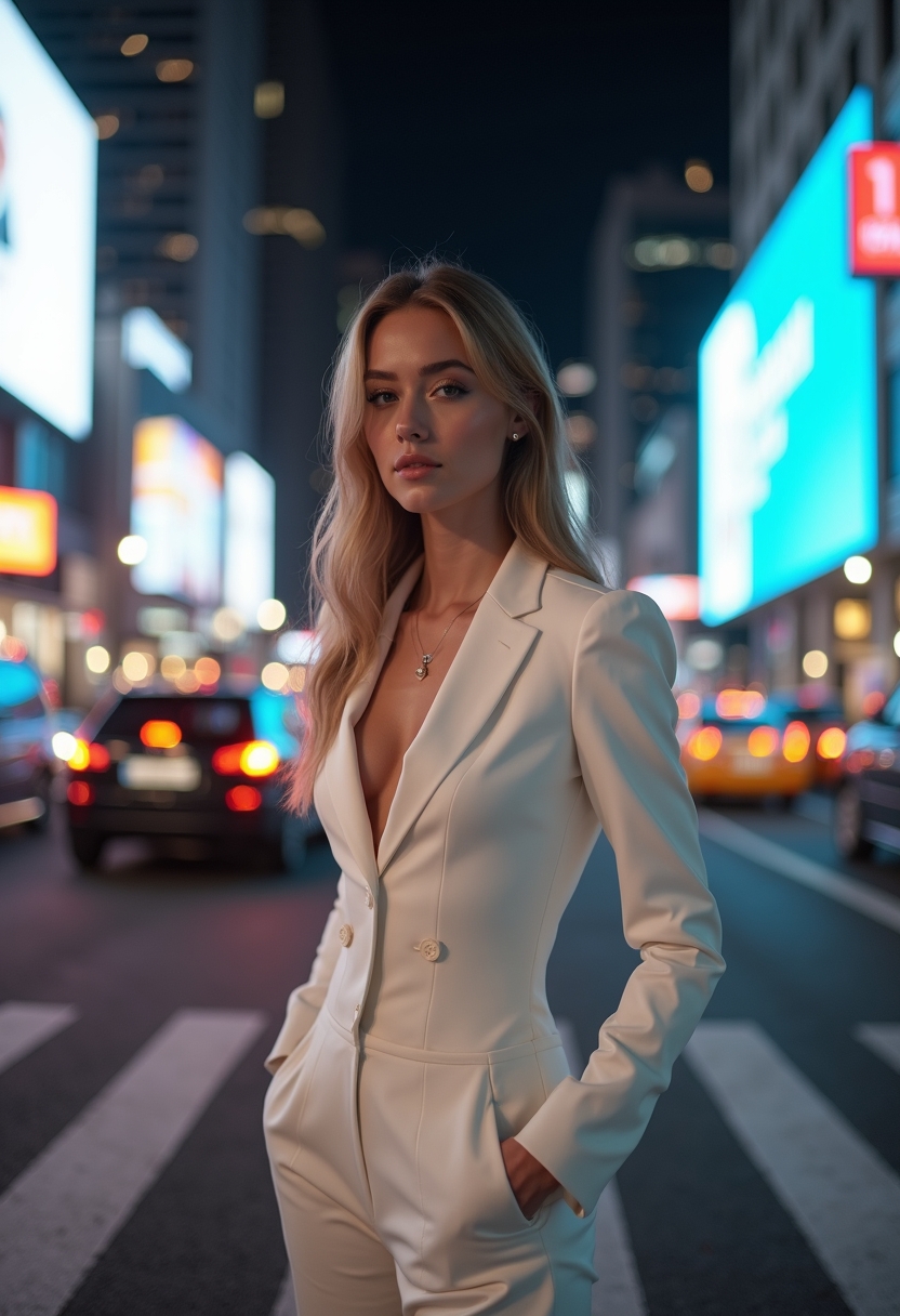 Женщина в белом брючном костюме стоит на пешеходном переходе в центре города, её фигура освещена яркими огнями рекламных щитов. Её взгляд направлен прямо в камеру, вокруг движущийся поток машин. Освещение хаотичное, подчёркивающее динамику города.