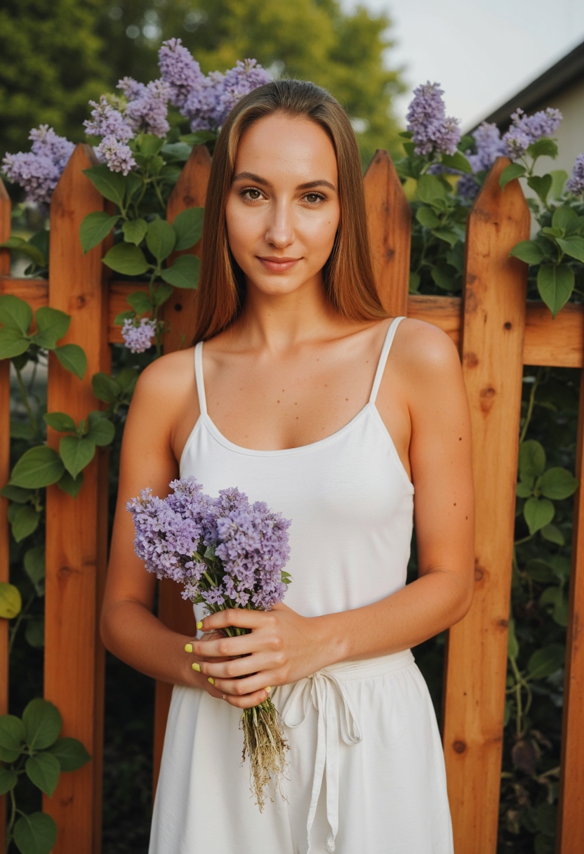 Женщина в белом комбинезоне с тонким поясом стоит на фоне сирени. Она держит в руках букет с сиреневыми цветами и смотрит прямо в камеру. Позади виден деревянный забор, украшенный зелёной листвой. Освещение тёплое, акцент на её естественности и весеннем окружении.