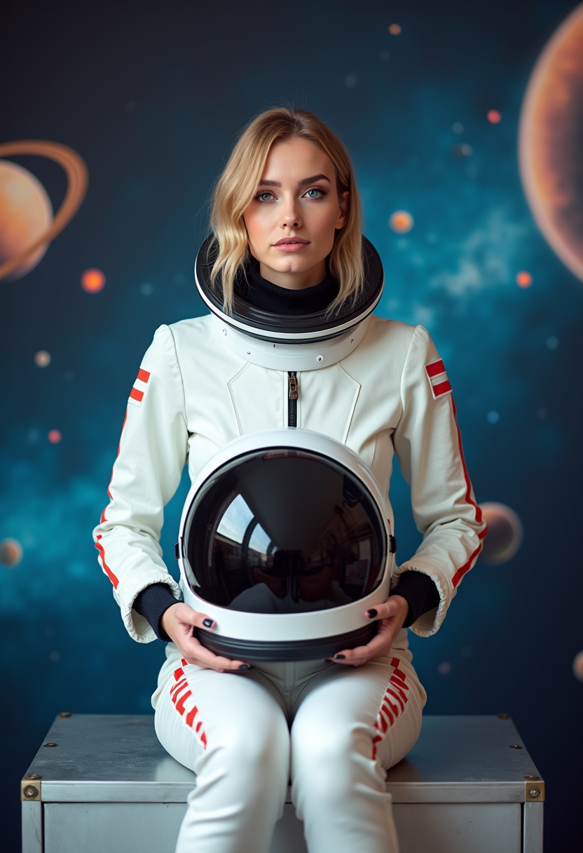 Женщина в белом костюме с ярко-красной полосой по бокам сидит на металлическом кубе. Позади — стилизованное звёздное небо и светящиеся орбиты. Она держит в руках шлем, глядя в камеру с гордостью. Крупный план, дух первых космонавток.