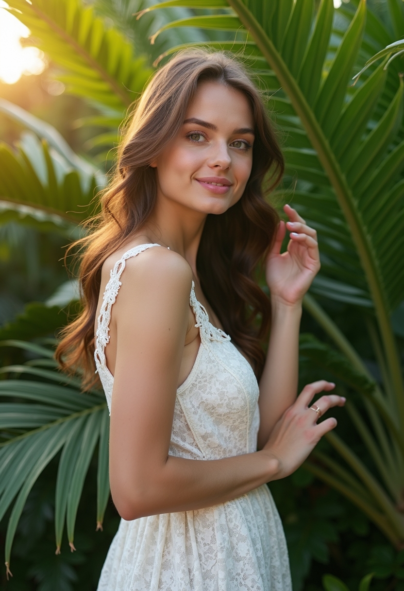 Женщина в белом кружевном платье с распущенными волосами стоит перед массивными зелёными листьями пальм в дендрарии. Она смотрит в камеру с лёгкой улыбкой, её руки мягко касаются листвы. Позади тёплый солнечный свет проникает сквозь густую зелень. Крупный план, подчёркивающий атмосферу уюта и природы.