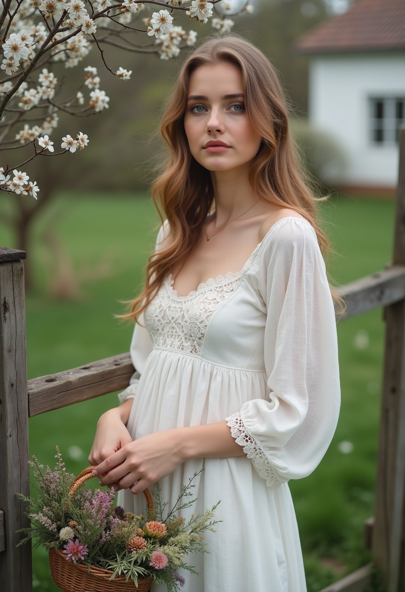 Женщина в белом льняном платье с кружевными вставками стоит у деревянной калитки, украшенной цветущими ветками. Её взгляд направлен прямо в камеру, а руки держат корзину с полевыми цветами. Позади видна зелёная лужайка и деревенский дом. Освещение мягкое, акцент на её нежности и природной гармонии.