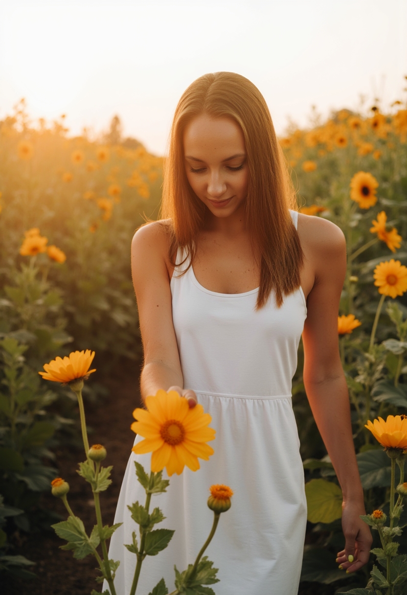 Женщина в белом минималистичном платье идёт по тропинке среди гигантских васильков, касаясь их лепестков. Её лицо освещено мягким рассветным светом, а на фоне тёплое утреннее небо. Освещение естественное, подчёркивающее чистоту образа.