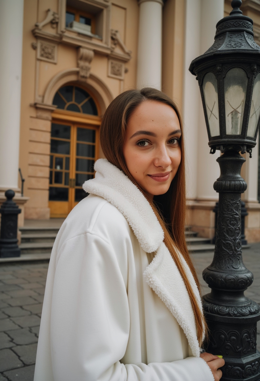 Женщина в белом пальто с меховой отделкой стоит возле исторического фонаря с металлическими узорами. Позади виден фасад здания в стиле классицизма с барельефами и высокими окнами. Она смотрит прямо в камеру с лёгкой улыбкой. Освещение тёплое, акцент на деталях фона.