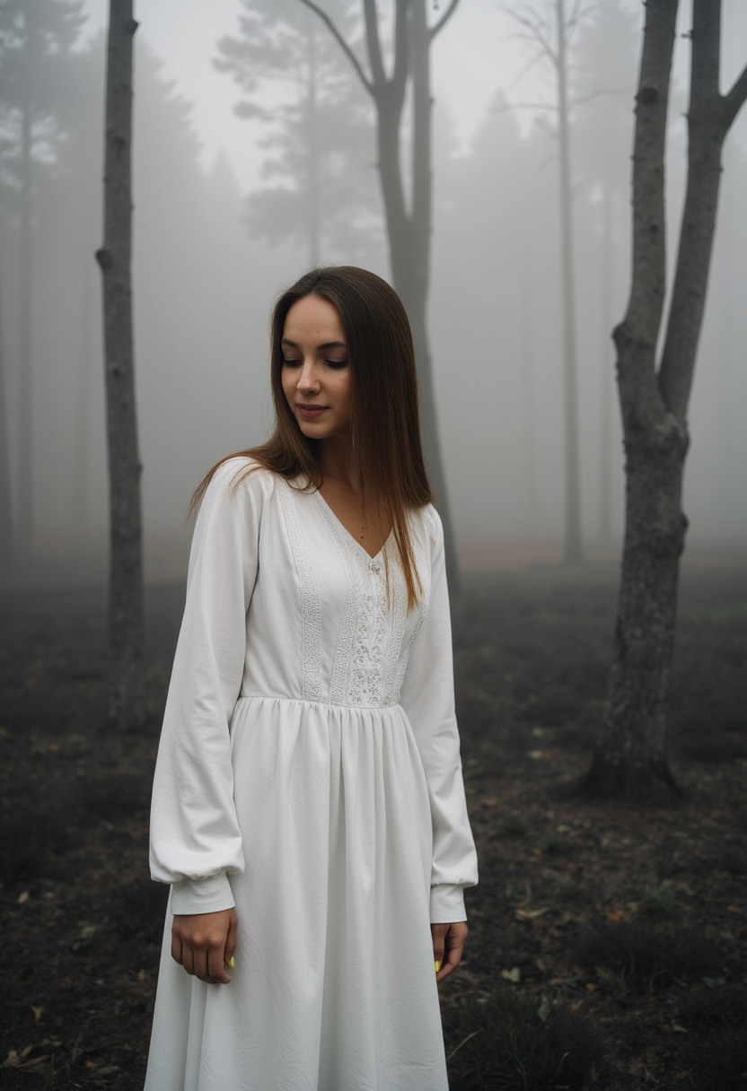 Женщина в белом платье с длинными рукавами стоит среди деревьев, скрытых густым туманом. Её лицо крупным планом, взгляд направлен вниз, руки держат подол платья. Чёрно-белая гамма, акцент на её загадочности и лёгкости образа.