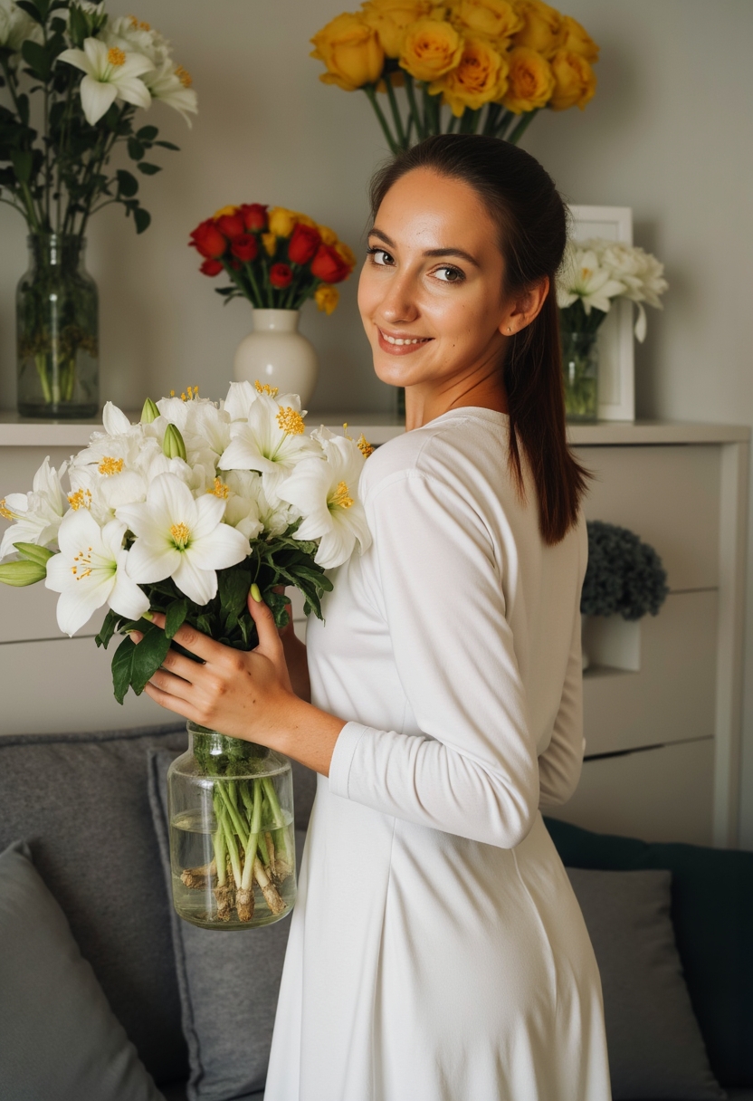 Женщина в белом платье с длинными рукавами стоит в комнате, украшенной вазами с цветами. Она держит в руках прозрачную вазу с белыми лилиями и смотрит через плечо в камеру. Освещение мягкое, акцент на её элегантности и обилии цветов.