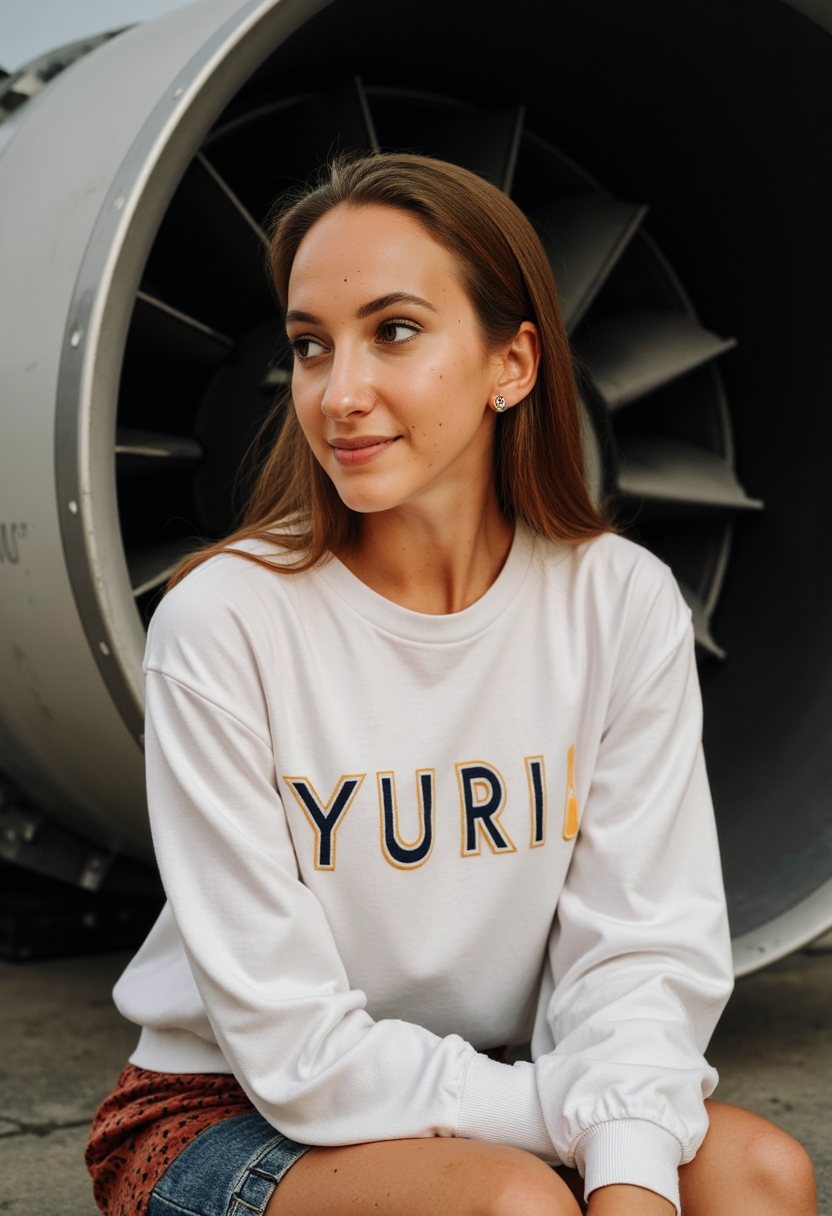 Женщина в белом свитере с надписью «Юрий» и блестящей юбке сидит на фоне ракетного двигателя, её взгляд направлен в сторону, поза расслабленная. Крупный план, стильная отсылка к ретро-космической теме.